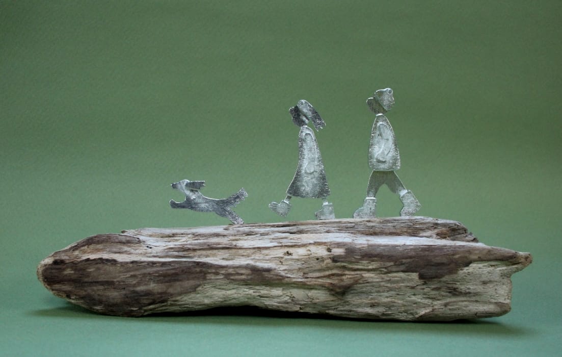 Length and depth measurements refer to the piece of driftwood and are approximate (wood is wiggly). The height refers to the driftwood plus the tallest piece of pewter. The figures themselves are two-dimensional and are approximately 6mm deep.